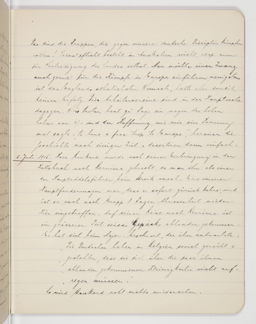 5th July 1915. Mr Burkard was transferred to Berrima after his stint in the Kallabush, as he was considered to be one of the ringleaders during the strike. One of our main demands was that he be brought back immediately and he has indeed returned after a bit less than 8 days. On his trip to Berrima a large part of his belongings went missing. He complained to the Major, who replied: