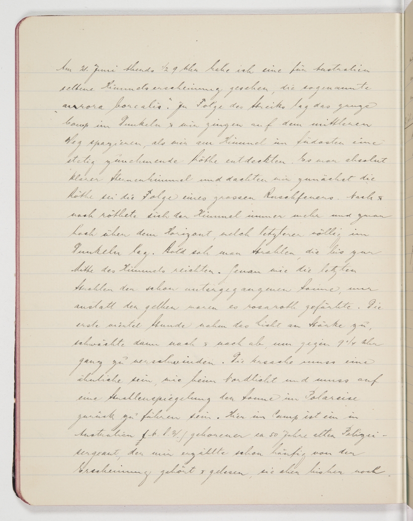 borealis”. Because of the strike, the whole camp was dark and when we went for a walk on the middle path we spotted an increasing redness in the sky to the south-east. The night was clear and starlit so we thought at first that the red light was due to a bushfire. But the sky turned more and more red and this high above the horizon, which was completely dark. Soon rays emerged from the centre, just as they would in a sunset, but instead of being yellow they were pink. In the first quarter of an hour the light seemed to grow more