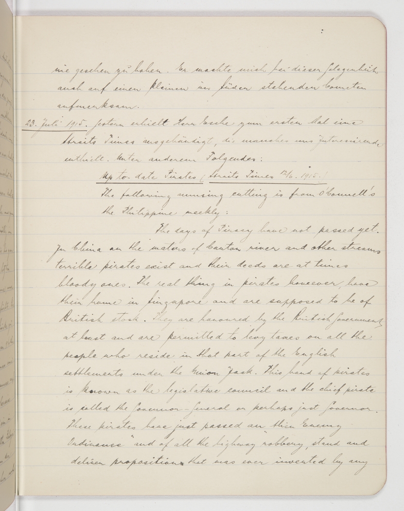 23rd July 1915. Yesterday Mr Esche was given, for the first time, a copy of the Straits Times, which contained much that was of interest to us. Among it this: [the following is in English in the original]