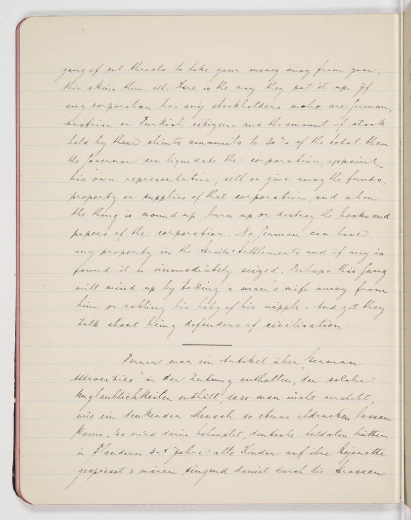 gang of cut-throats to take your money away from you, this skins them all. Here is the way they put it up. If any corporation has any stockholders who are German, Austrian or Turkish citizens and the amount of stock held by these clients amounts to 30% of the total then the Governor can liquidate the corporation, appoint his own representative, sell or give away the funds, property or supplies of that corporation, and when the thing is wound up, burn up or destroy the books and papers of the corporation. No German can have any property