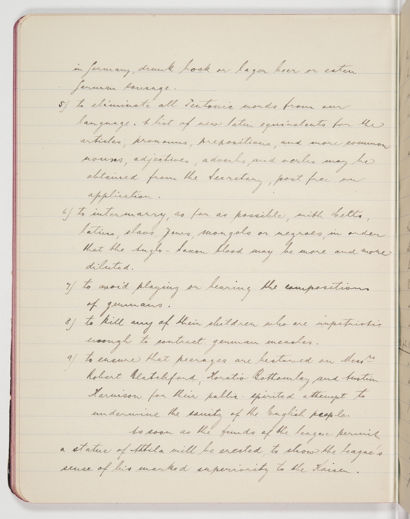 5) to eliminate all Teutonic words from our language. A list of new Latin equivalents for the articles, pronouns, prepositions, and more common nouns, adjectives, adverbs and verbs may be obtained from the Secretary, post free on application.