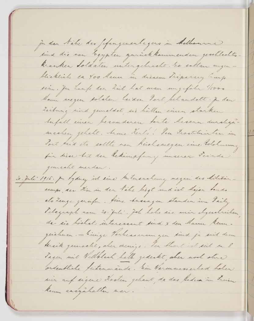 In the vicinity of the Melbourne camp, they’ve put up the soldiers returning from Egypt and suffering from venereal disease. Allegedly there are about 400 of them right now in this Triparary Camp. Over time, 4000-5000 men have been treated there for such ailments. The newspapers reported that the men had been hit by a particularly strong strain of measles. Poor guys! The prostitutes of Port Said should be rewarded by the German empire for having done their bit to wound our enemies.
