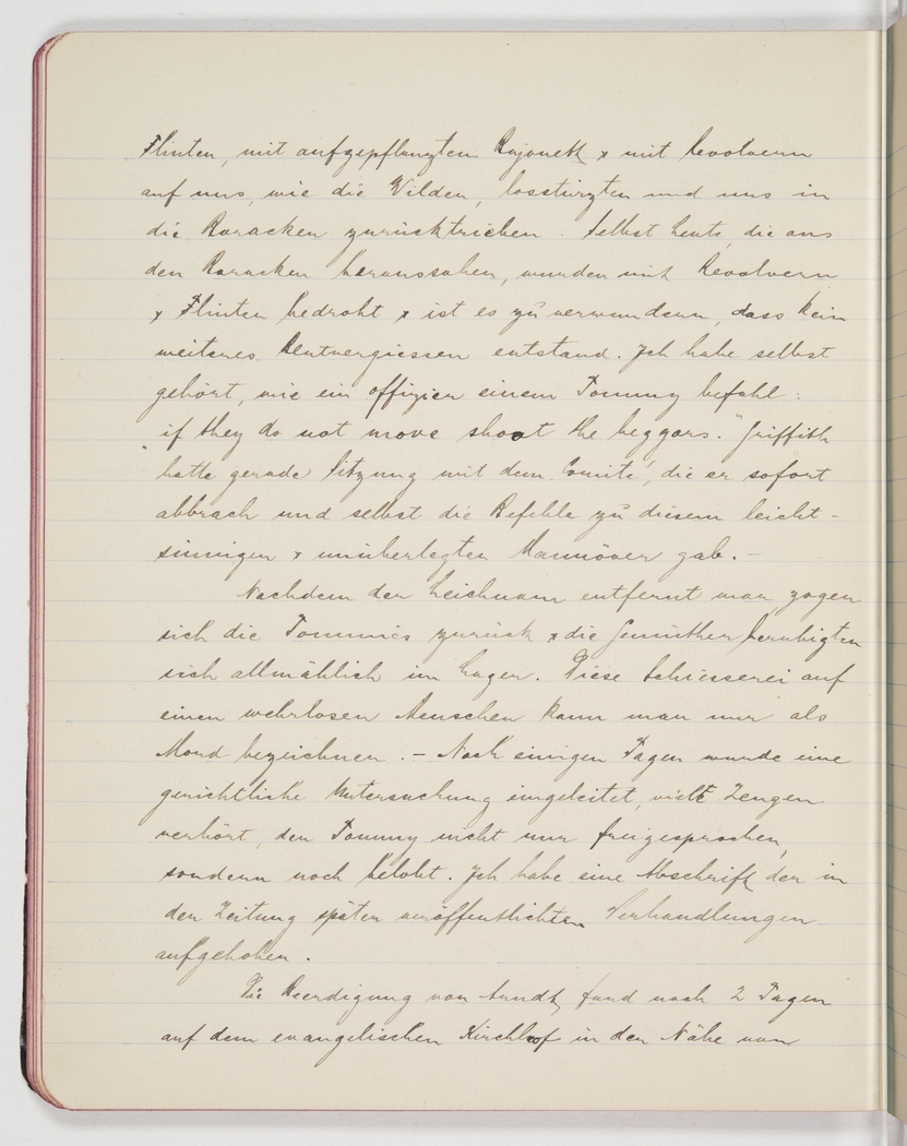 Once the dead body had been removed the Pommies retreated and the camp regained some composure. But this shooting at defenceless people can only be called murder. A few days later there was a judicial investigation into the affair, with countless testimonies, but in the end the Pommy was acquitted and even praised. I have kept a copy of the