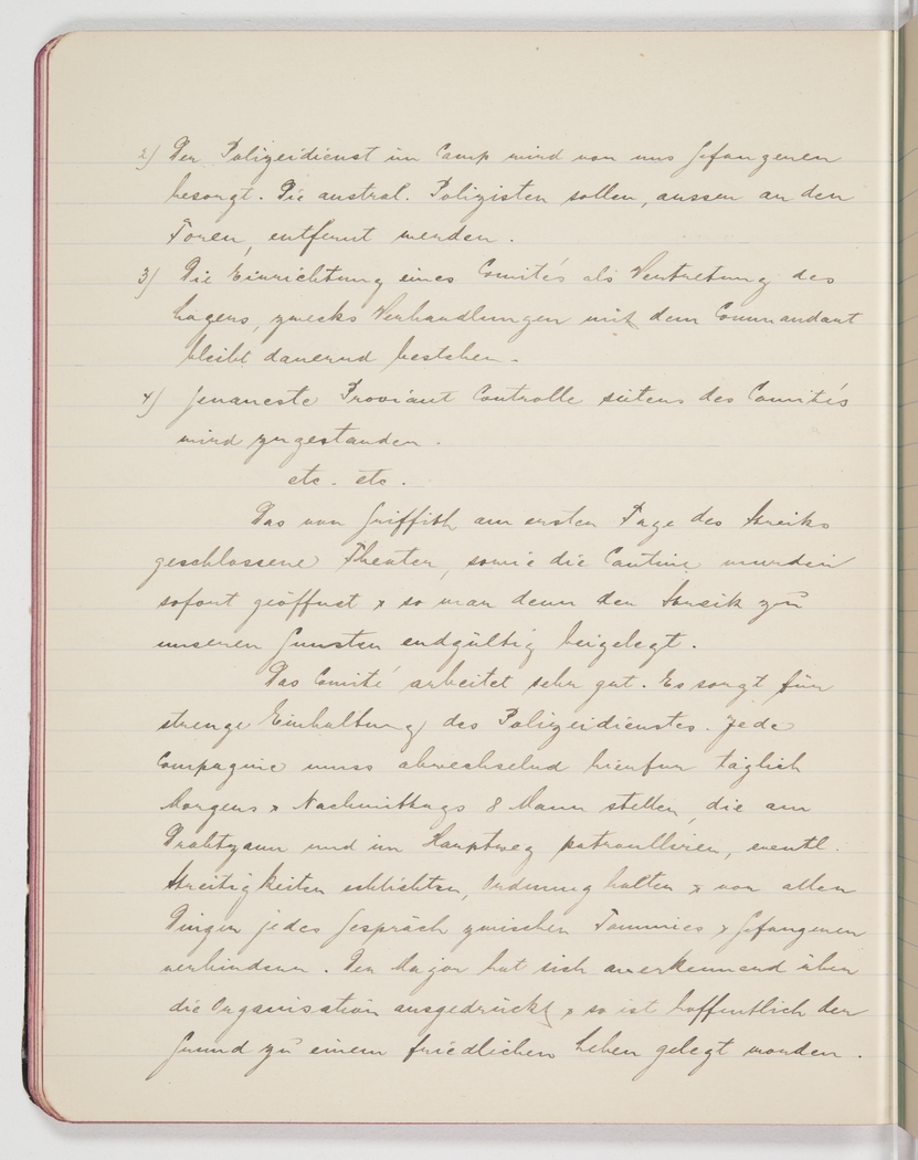 The committee works very well. It ensures strict policing of the camp. To this purpose, each company provides 8 men a day, alternating mornings and afternoons, who patrol along the barbed wire and the main path, keeping order, mediating if necessary and, above all, preventing any talk between Pommies and prisoners. The Major expressed appreciation of the organisational skill and so we hope to have laid the basis for a peaceful existence.