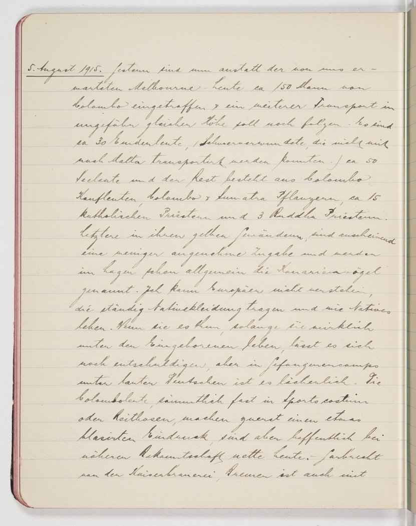 5th August 1915. Yesterday, instead of the Melbourne people we were expecting, some 150 men from Colombo arrived, and another lot of similar size is to follow. There are about 30 people from the “Emden” (critically injured, who could not be sent on to Malta), about 50 seamen, and the rest are merchants from Colombo, plantation people from Colombo and Sumatra, about 15 catholic priests and 3 buddhist priests. The latter, in their yellow robes, are seemingly a less appreciated addition and the camp has already nicknamed them canaries. I cannot understand Europeans who constantly dress in native clothes and live