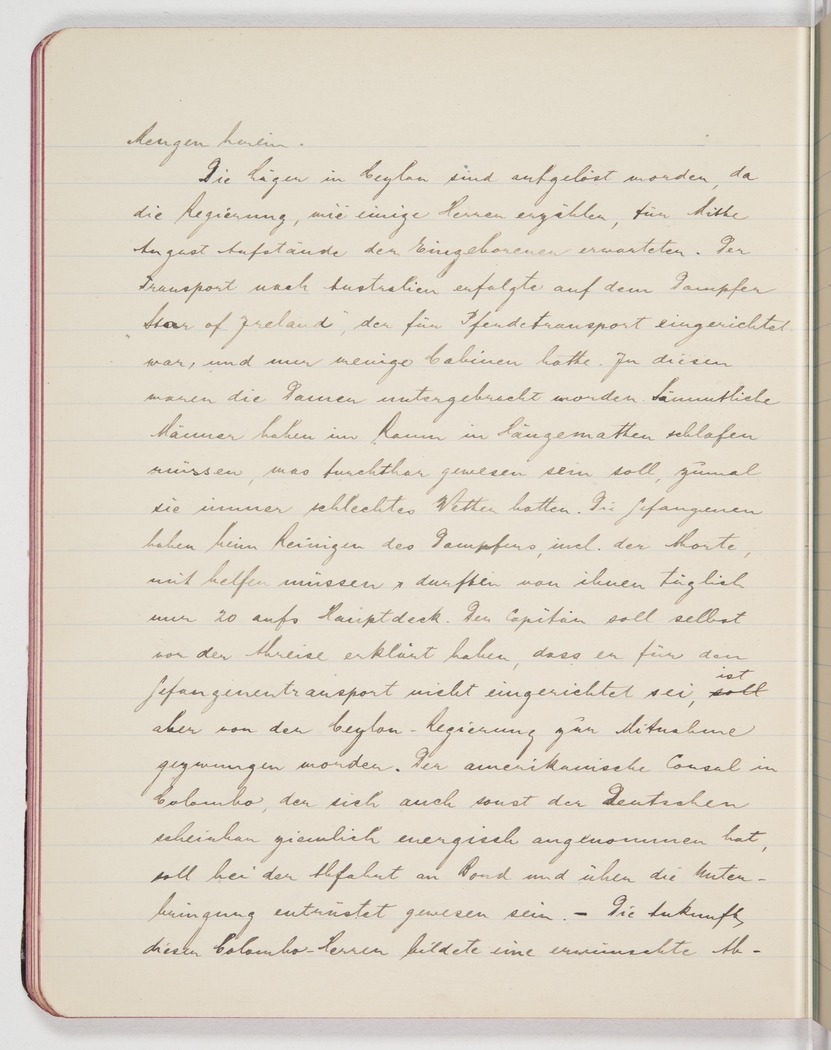 The camps in Ceylon have been closed because the government was expecting some indigenous uprisings for mid-August, as some of the gentlemen told us. They were shipped to Australia on the steamer ‘’Star of Ireland’’, which was really equipped for the transport of horses and had only a few cabins. Those were given to the ladies, while all men had to sleep in hammocks in the hold, which was said to have been awful, not least because the weather was bad all along. The prisoners had to help clean the ship, including the lavatories, and only 20 a day were allowed up on deck. The captain supposedly said from the start that he was not equipped for the transport of prisoners, but the Ceylonese government forced him to do it. The American consul in Colombo, who apparently looked after the Germans quite rigorously, is said to have been outraged about the conditions when he saw them off on the day of the departure. – The arrival of these Colombo gentlemen is a welcome