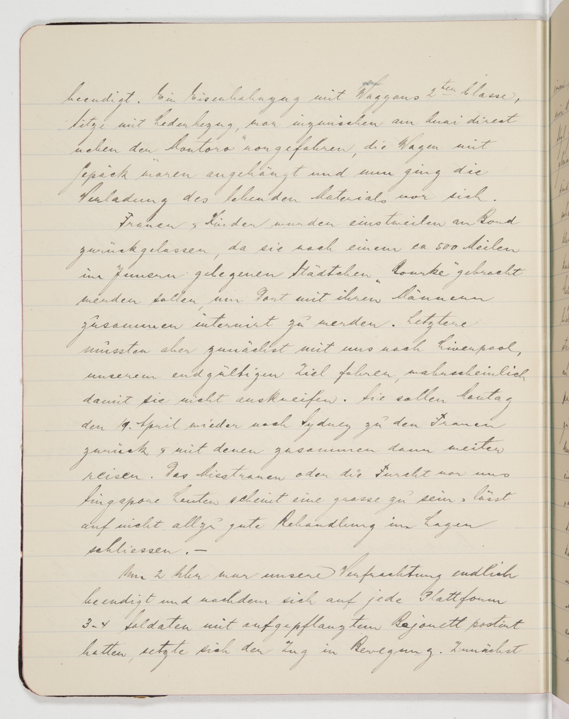 Women and children had been left on board [the steamship] for now, because they would subsequently be transferred to a town called Bourke, about 500 miles inland, where they would be interviewed together with their husbands. The latter, however, first had to come with us to Liverpool, our final destination, probably so they wouldn’t escape. They would be brought back to their wives on Monday, 19 April, and then continue travelling with