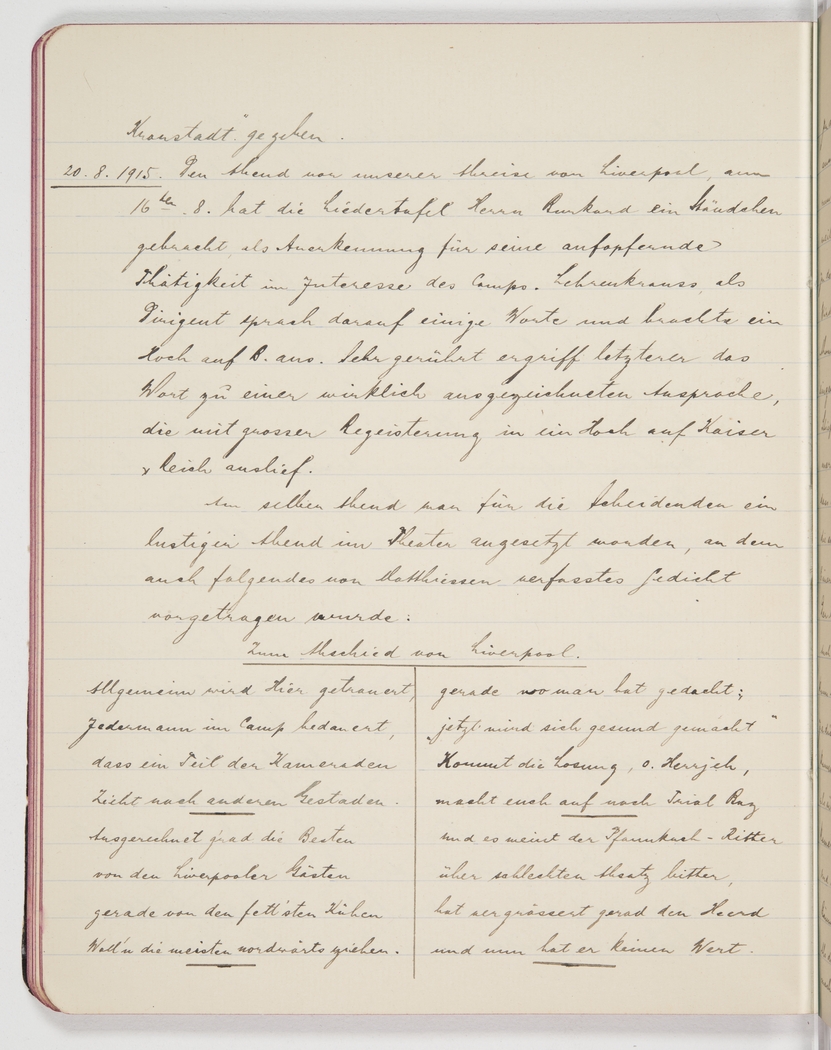 20.8.1915. On the eve of our departure from Liverpool, on the 16th of August, the choral society gave Mr Burkard a serenade in honour of his selfless activity in the interest of the camp. Lehrenkrauss, the conductor, said a few words and toasted B. Deeply touched, the latter then made a speech that was truly exceptional and was received with great enthusiasm and a toast to the Kaiser and the Empire.