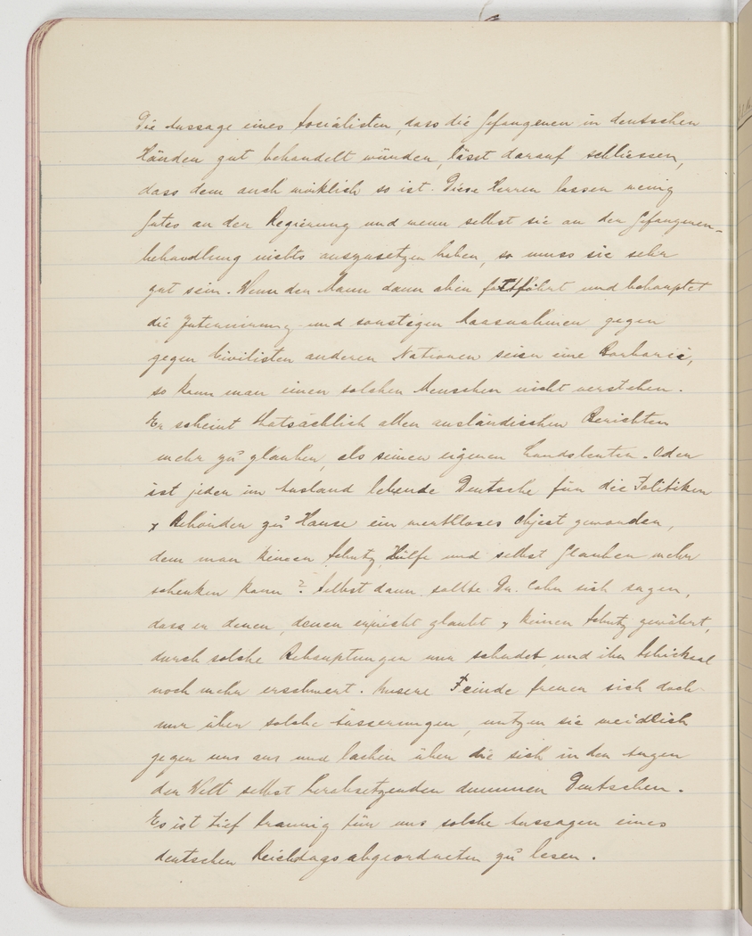The statement by a socialist that prisoners in German care are treated well suggests that this is indeed so. These gentlemen have few positive things to say about the [German] government and if they can’t find fault with the treatment of prisoners, it must be very good. But when this man then goes on to call the internment of, and othe r measures against, civilians of other nations barbarian, it’s hard to take him seriously. He seems to trust foreign reports more than the accounts of his compatriots. Or is it that every German expatriate has become a useless subject for the politicians and authorities at home, not worthy of protection, assistance or even trust? Because Dr Cohn should be aware that he robs those whom he doesn’t believe of protection, that his statements endanger them greatly. Our enemies can only enjoy such statements, using them against us and exposing the dumb, self-denigrating Germans to the derision of the world. It is very sad for us to read such statements by a representative of the German Reichstag.