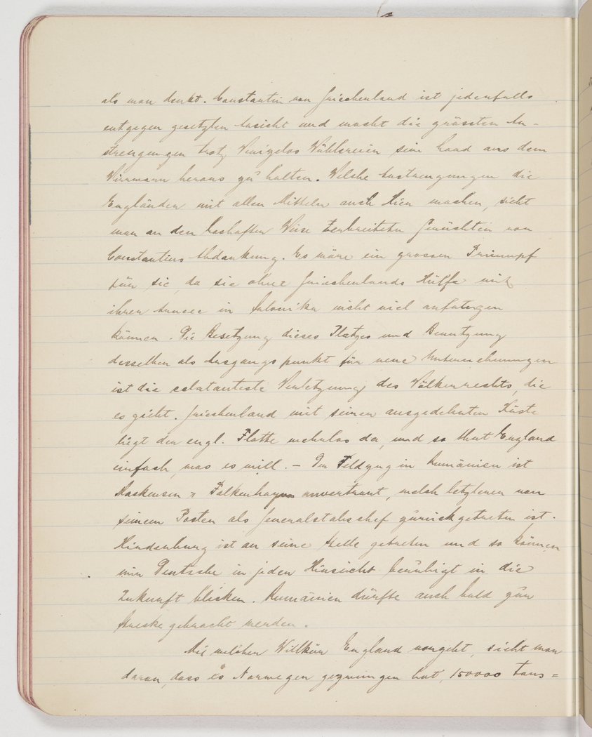 against the English fleet, and so England can do whatever she wants. — The Romania campaign is led by [Harkensen?] and Falkenhagen, the latter having stepped down as Chief of General Staff. Hindenburg has replaced him and thus we Germans can face the future with great confidence. Romania will soon be hunted down.