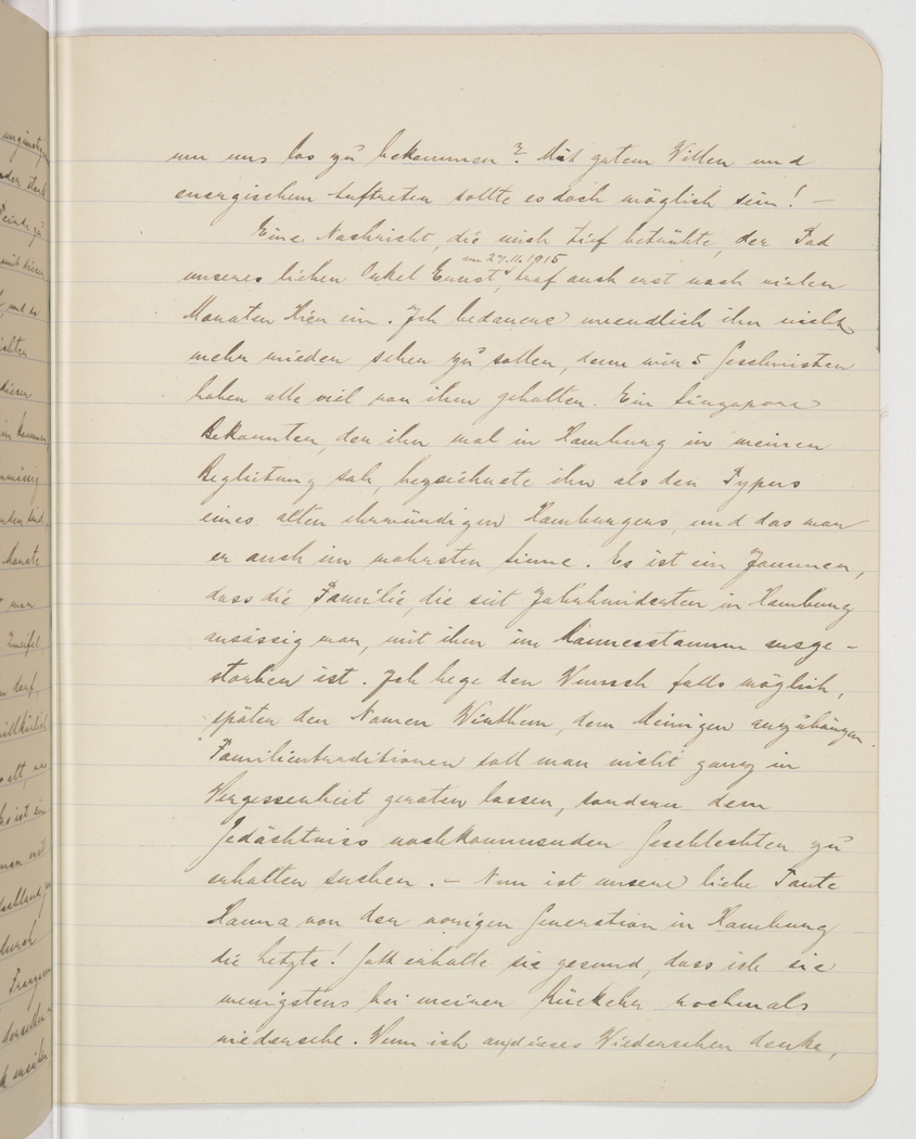 27/11/1915, also did not reach me for many months. I deeply regret that I won’t see him again, because we 5 siblings held him in great esteem. A Singapore acquaintance who once met him in Hamburg in my presence called him the very archetype of a venerable Hamburg gentleman and by God, he was. It’s a pity that his family, who has resided in Hamburg for centuries, is now left without a direct male descendant. I would like to add his family name, Winthern, to mine in future, if that’s possible. We should not consign family traditions to the past, but try to keep them alive for future generations. — Now our dear Aunt Hanna is the only one left in Hamburg of the previous generation! May God grant her a long life so that I can see her again upon my return. When I think of this reunion, I feel as if I’m about to see my dear old mother again, even if she has been dead for years. The two sisters so resemble each other in their character, their feminine wisdom and kindness, that our love for Hanna is almost as strong as that for our mother.