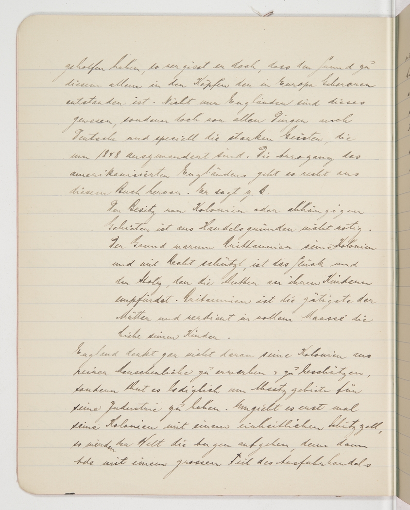 England doesn’t for a minute have love on her mind when she acquires and protects her colonies; she does it purely in order to secure a market for her industries. Once she fences in her markets with standardised tariffs, the world’s major industrial