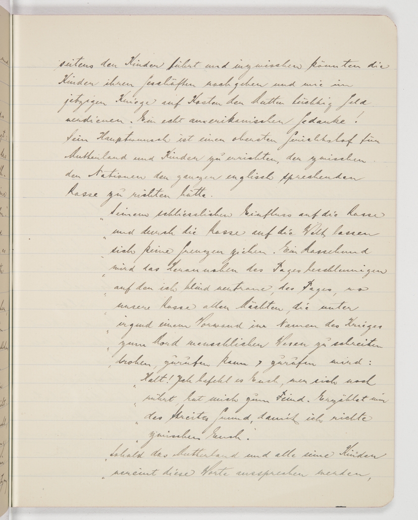 This article “Imperial Federation”, a federation of all English-speaking countries and the United States, is interesting in that Carnegie here sees himself as quite the shrewd American. Should such a federation eventuate, he clearly hopes that England as the motherland would be in charge of defending her children. She’d be waging war on behalf of the union, albeit financially aided by it, while her children pursue their own affairs to great financial benefit and at their mother’s cost, just as it happens in this war. A truly American idea! His main desire is to establish a supreme court for motherland and children that would arbitrate for all English-speaking people.