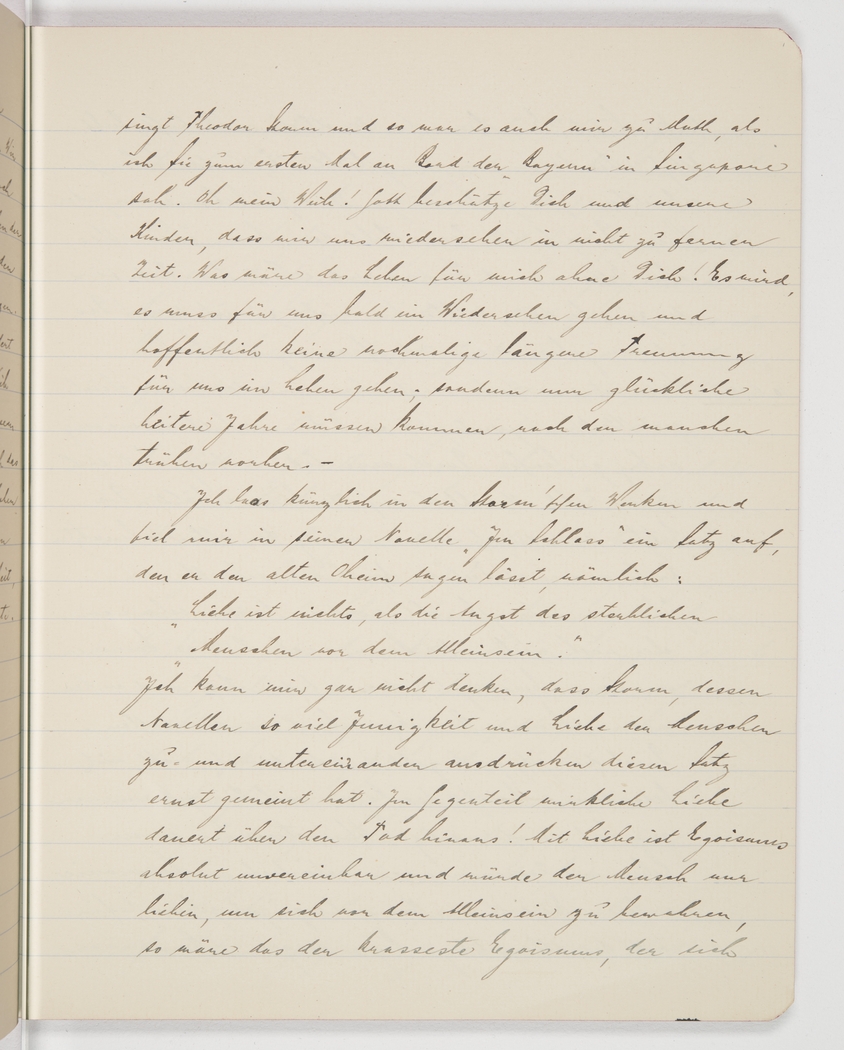 saw her aboard the “Bayern” in Singapore. Oh my wife! May God protect you and our children, and may we see each other again in a not so distant future. My life would be empty without you. There will, there must be a reunion soon, and then hopefully never again another lengthy separation in our lives; there need to be nothing but happy, carefree years after the many sad ones before.