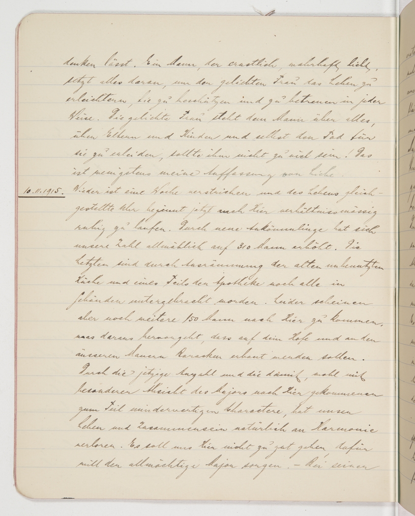 10/11/1915. Another week has lapsed and life’s clock is ticking more quietly here. New arrivals have slowly pushed our numbers to 310. The last ones arriving could still be accommodated indoors by fixing up the old, unused kitchen and clearing out part of the dispensary. But apparently another 150 men are due to arrive, and there are plans to erect barracks in the courtyard and outside the walls. Already, due to the large number of men and to the fact that, surely by the Major’s design, some of them are inferior characters, our coexistence has lost a great deal of harmony. The almighty Major will make sure we won’t be too comfortable here. During his