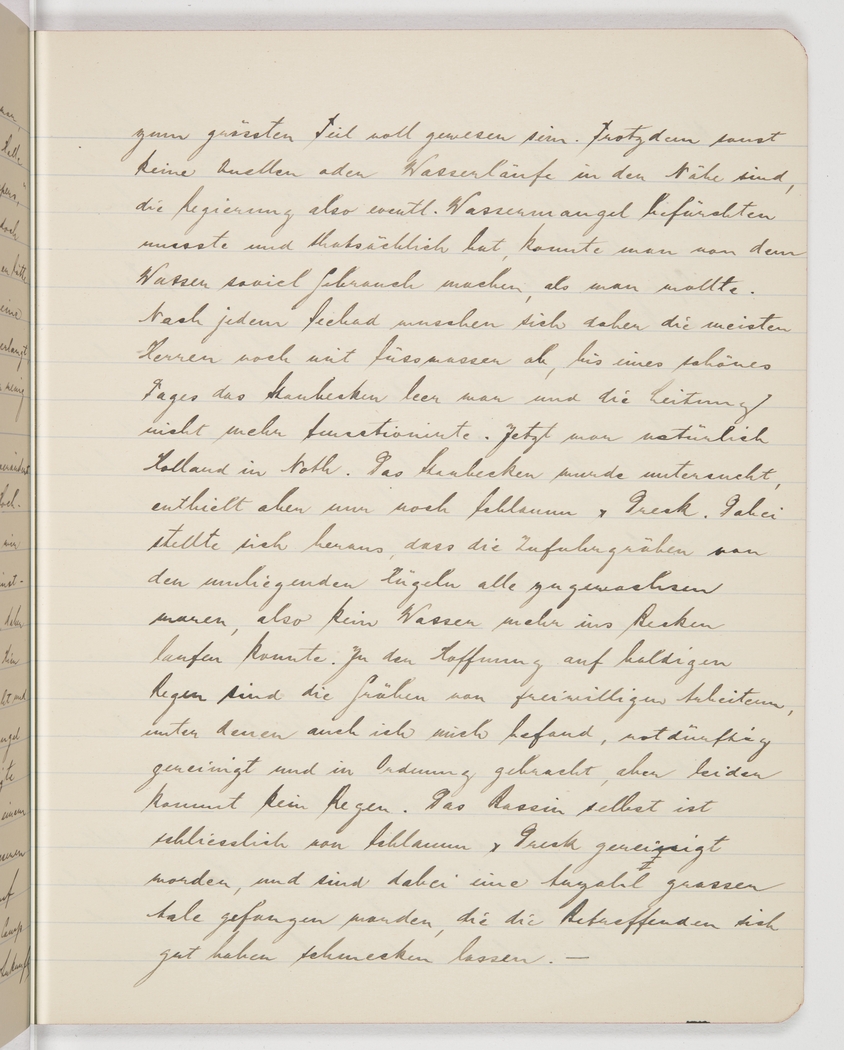 pretty much full when we arrived. Even though there are no other sources of fresh water such as springs or creeks nearby and the government had to be mindful of a potential water shortage, which is now happening, they let us use as much water as we wanted. After each dip in the ocean most gentlemen thus rinsed off with fresh water until one fine day the [large] reservoir was empty and the pipes stopped functioning. Now, of course, there was red alert. They checked out the reservoir and found nothing but mud and dirt. But on this occasion they discovered that all the feeding ditches were overgrown and water couldn’t even flow into the reservoir. In the hope of some imminent rain a bunch of volunteers including myself cleaned out the ditches as best as we could, but alas, no rain. The basin itself was also cleaned and while they got rid of mud and dirt they also found quite a few eels which made for a nice meal.