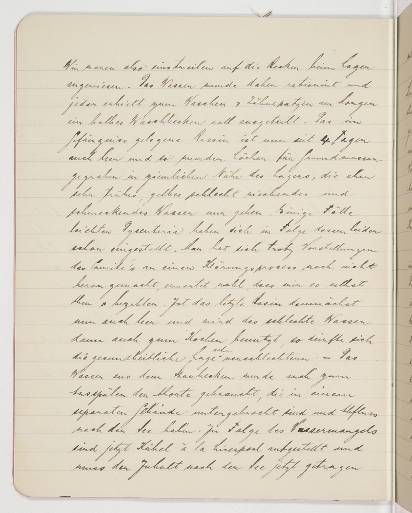 So for the time being we had to make do with the two smaller reservoirs. Water was rationed and each of us received half a washbasin of it in the morning to wash ourselves and brush our teeth. The reservoir within the compound has now also been empty for 4 days and so we dug holes for groundwater fairly near the camp, but that water is muddy, yellow and foul-smelling and tasting. We promptly had a few cases of mild dysentery. Despite an appeal by the committee, the authorities have not yet gotten down to any kind of water treatment, they are probably waiting for us to do it and pay for it. So once the last basin is empty and they start using the foul water in the kitchen, our health will surely deteriorate rapidly. The fresh water from the reservoir had been used to rinse out the lavatories, which are located in a separate building and drain into the ocean. As a result of the water shortage, they have set up buckets à la Liverpool that now have to be carried to the ocean to be emptied and