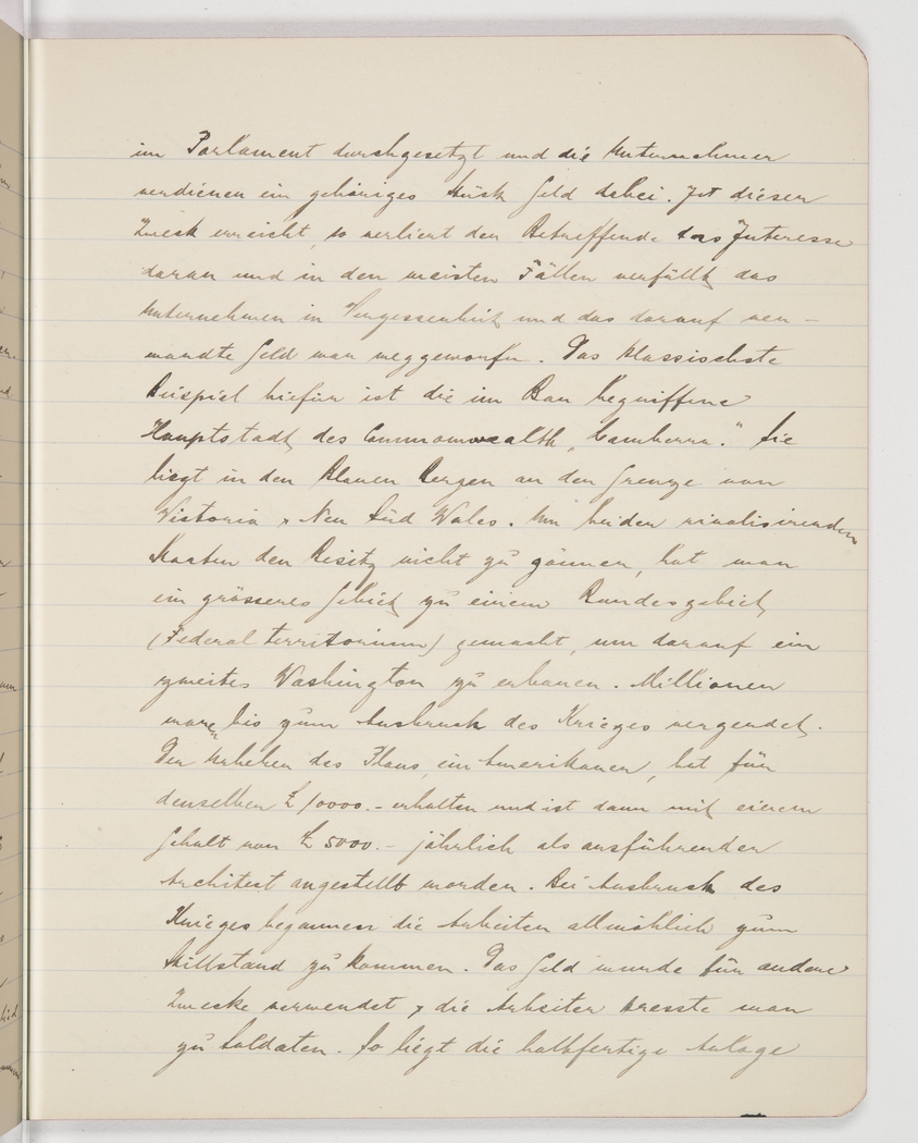 then forces through Parliament, and many a contractor earns very good money. At this stage, the proponent loses interest and in most cases, the project will be abandoned and forgotten, and the money spent was wasted. A classic example of this is the planned capital of the Commonwealth, Canberra, which is under construction. It is located in the Blue Mountains on the border between Victoria and New South Wales. So as not to grant either of the two rival states possession [of the capital] a fairly large tract of land was turned into federal territory upon which a second Washington was to be built. Millions were wasted until the outbreak of war. The author of the plan, an American, received
