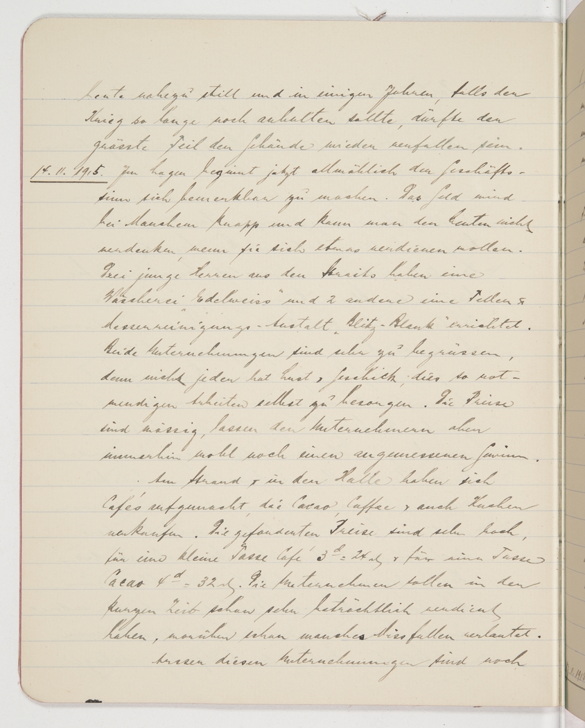 14/11/1915. Business sense seems to slowly get hold of many here. Many are running out of money and you can’t really blame them for wanting to earn something. Three young men from the Straits have opened a laundromat, “Edelweiss”, and 2 others have begun a dish and cutlery-cleaning service, “Spick and Span”. Both enterprises are welcome since not everybody has the inclination and ability to do these necessary chores. The prices are modest but presumably still leave a small profit to the entrepreneurs.