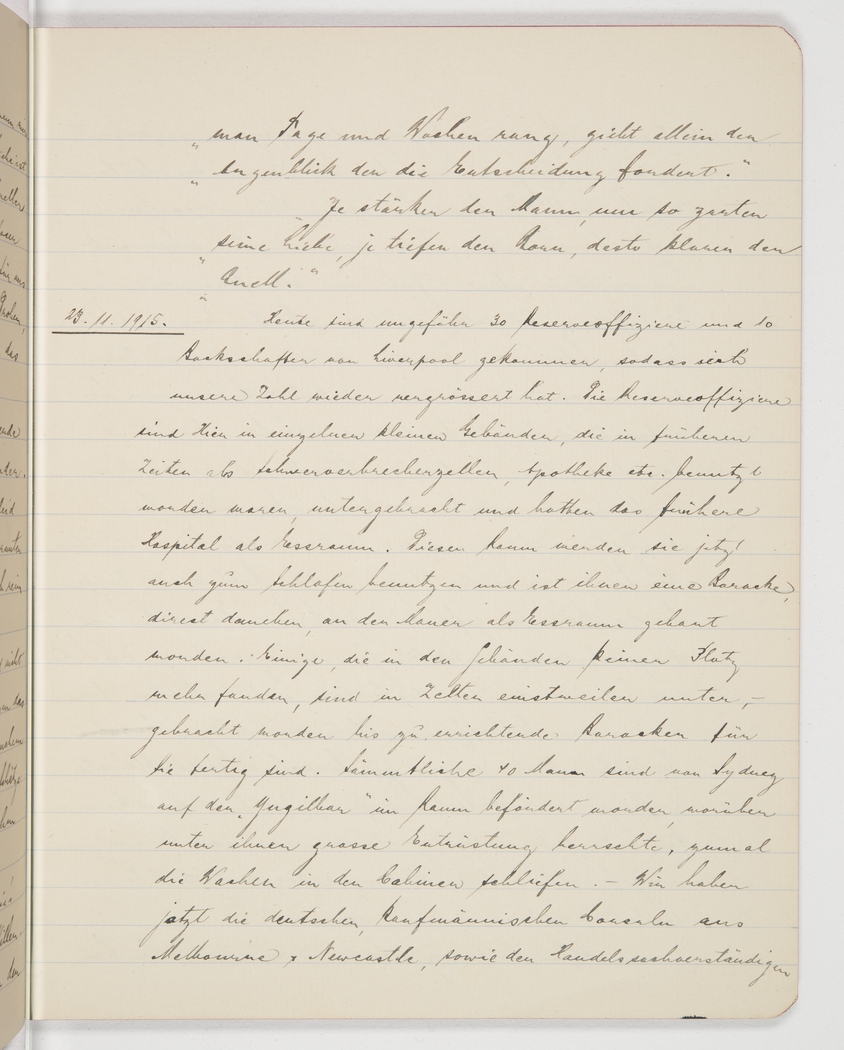 23/11/1915. Today, about 30 reserve officers and 10 [indecipherable] have arrived from Liverpool, so our numbers have swelled once more. The reserve officers have been housed in individual small buildings that used to be high-security prison cells or were used as pharmacy, etc, and an erstwhile hospital was their mess. That will now be used as a dormitory and so another barrack was built alongside the compound wall that will serve as the new mess. Some who didn’t find space in the buildings are temporarily housed in tents until some more barracks are erected. All 40 men were transported in the hull of the “Yuzilbar’’, which greatly enraged them, especially since the guards slept in the cabins. We now have the German commercial attachés from Melbourne and Newcastle, as well as the trade representative from Sydney,