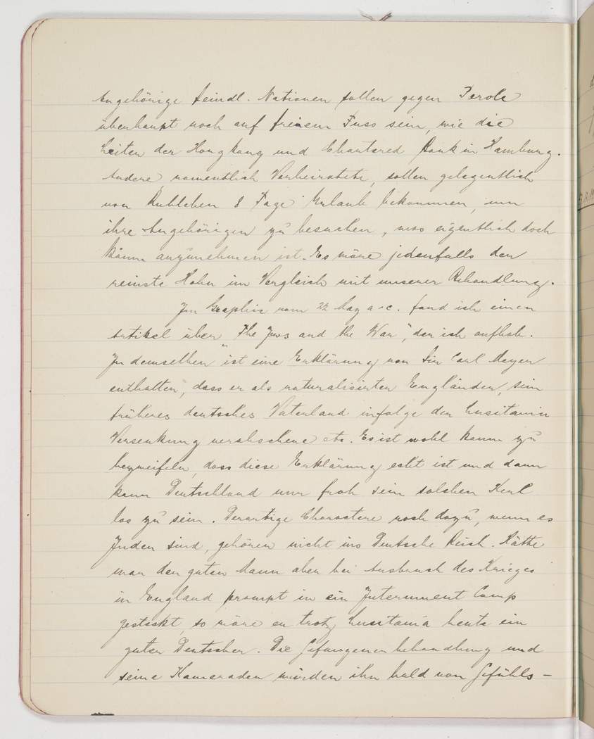 In the [Graphic?] of Dec. 22 of this year I saw an article on “The Jews and the War” which I kept. It contains a declaration by Sir Carl Meyer that he, as a naturalised Englishman, abhors his erstwhile German homeland since the sinking of the Lusitania, etc. No doubt the statement is true and in that case, Germany can only be glad to be rid of the guy. Such characters, especially if they are Jewish, have no place in the German Empire. However, if the English had promptly interned the man upon the outbreak of war, he’d be a good German today, despite the Lusitania. The camp life and his comrades would have soon cured him of his