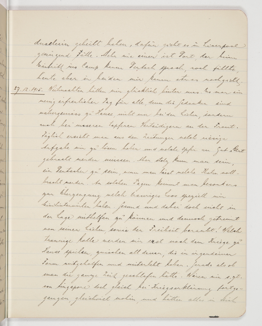 27/12/1915. We’ve put Christmas safely behind us. It was an unhappy day for most of us since our thoughts naturally were with our loved ones, but also with the brave defenders of our borders. Daily we can judge from the newspaper reports how difficult a task that must be and what sacrifices have to be made. But one can be proud to be German when reading of the deeds achieved. On such days the fate of a civilian internee is particularly hard to bear. Healthy we are and yet impotent, unable to help the cause, separated from our loved ones, robbed of our freedom! Imagine the sad part we’ll be playing after the war, among all those who fought at the front or helped the cause in some other way.