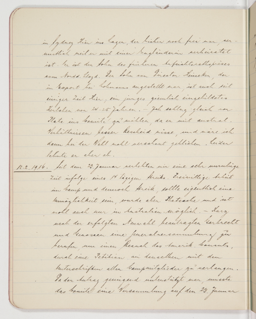 12/2/1916. Since January 23 we’ve had a rather tumultuous time because of a 14-day strike. Voluntary work in camp and yet a strike – should be impossible but became reality, it’s only possible in Australia. Shortly after the new election Gerbrecht and comrades proposed a plenary meeting that would demand the visit of the American consult via a petition signed by all camp inmates. Because the motion was carried by enough people, the committee reluctantly called the meeting for January 23.
