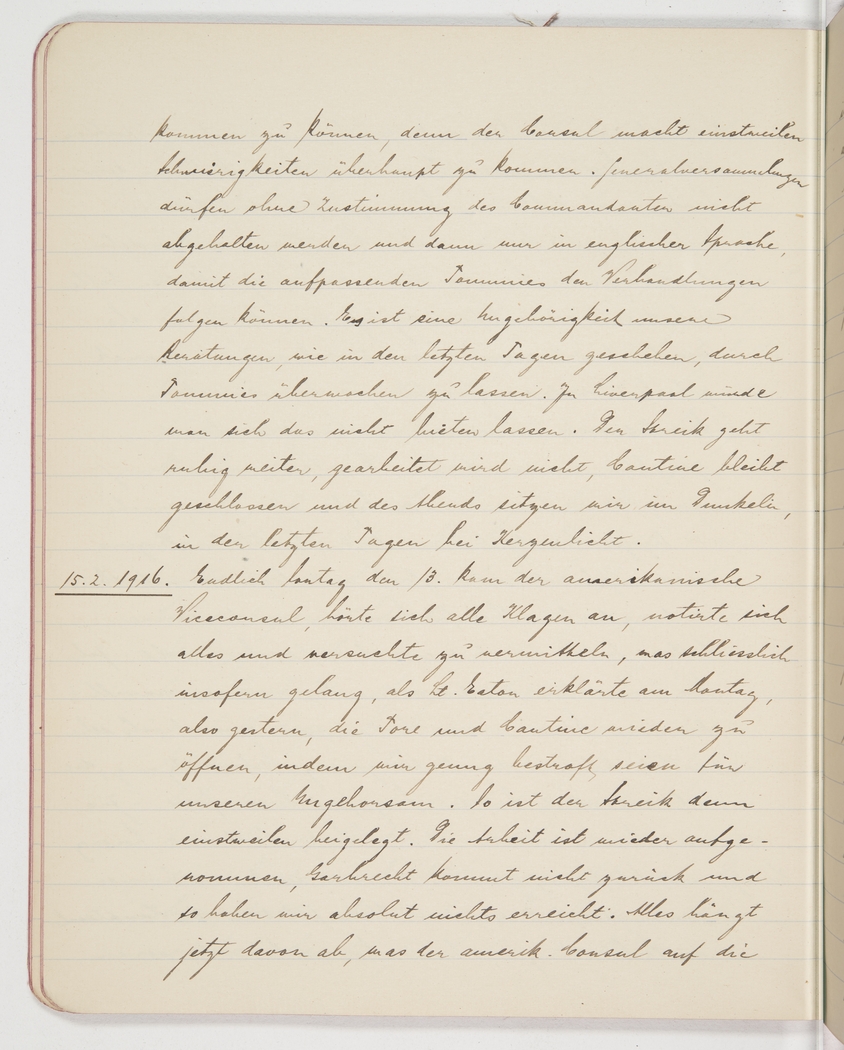 15/2/1916. Finally, on Sunday the 13th, the American vice-consul came, listened to all our complaints, made notes and tried to mediate, in so far successfully as Lt. Eaton declared on Monday, i.e. yesterday, that we had been punished enough for our insubordination and that the gates and the canteen would be reopened. Thus the strike was terminated for the time being. Work is being resumed, Gerbrecht will not return and so absolutely nothing has been achieved. It all now depends on how the American consul