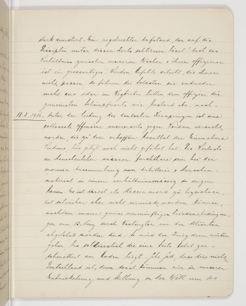 18/3/1916. Under the command of the German Crown Prince, a huge offensive against Verdun was launched, but so far the goal – the capture of Verdun – has not been achieved. The loss of human life must be horrendous given the enormous amount of artillery and human material [sic] assembled in a relatively narrow space. One could call