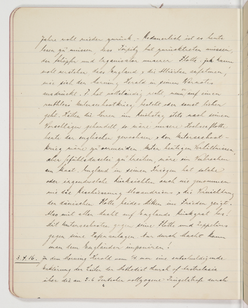 years. It was with great regret that I read today that Törpitz, the creator and organiser of our fleet, had to resign. I can fully understand that England and the Allies breathed a sigh of relief, as the Morning Herald wrote in its war notes. T. is absolutely right to insist on a “ruthless” submarine war or else to resign. If the gentlemen in the Reichstag had acted upon his advice at all times, our deep sea fleet would hold its own against the British