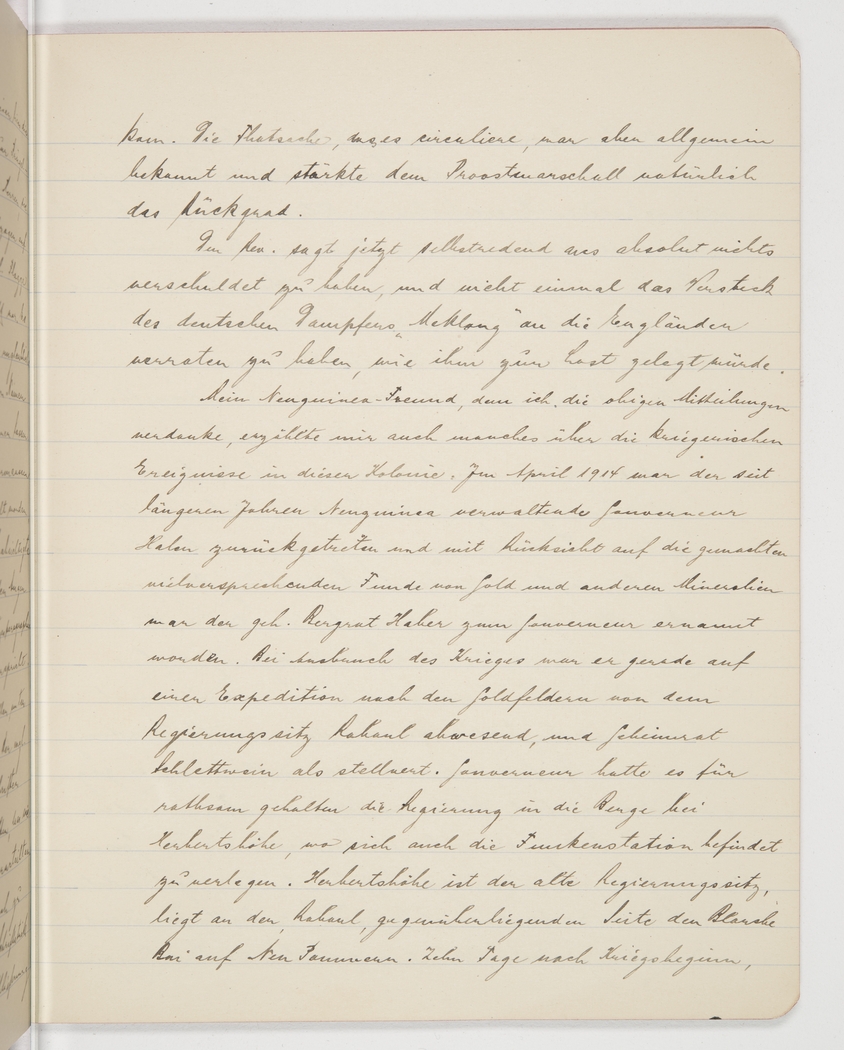 My friend from New Guinea, who related all of the above to me, also told me a lot about the war events in that colony. In April 1914, the long-time governor of New Guinea, Holms, stepped down and in recognition of the auspicious discoveries of gold and other minerals, Resources Minister [Bergrat?] Haber was elected governor. When war broke out, he [Haber] happened to be on an expedition into the gold fields and absent from the government house in Rabaul, and the deputy governor, Privy Councillor [Geheimrat?] Schlettwein, thought it prudent to move the government to the mountains near Herbertshöhe, where the radio tower was. Herbertshöhe is the old seat of government, situated across from Rabaul on the opposite side of Blanche Bay, in New Pomerania. Ten days after war broke out,