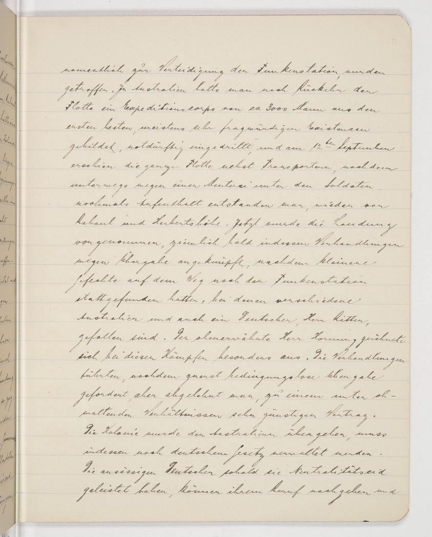 were made, especially for the defence of the radio tower. In Australia, after the return of the fleet, a corps of some 3000 men, randomly selected and of mostly very questionable character and provenance, was mustered and superficially drilled, and on September 12, the whole fleet with all the transport vessels reappeared at Rabaul and Herbertshöhe, after a forced break along the way because of a mutiny among the soldiers. This time they attempted to disembark, although soon accompanied by negotiations after a few skirmishes on the way to the radio tower had resulted in several Australian casualties