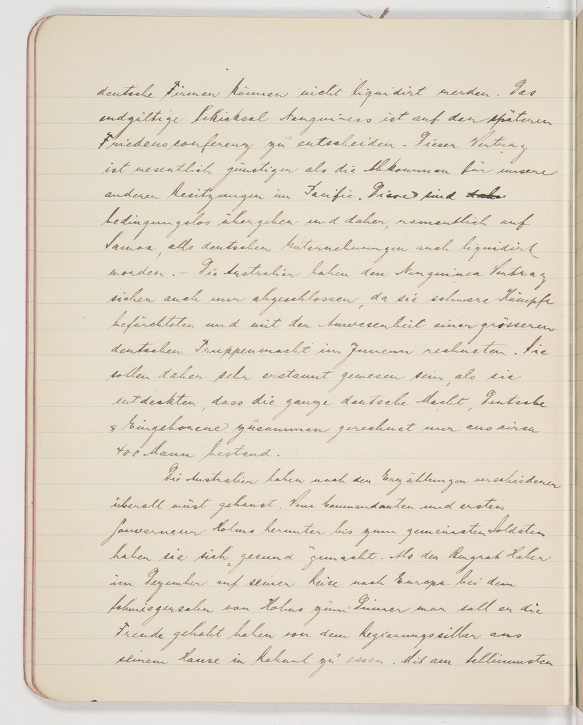 and the German companies will not be liquidated. The ultimate fate of New Guinea will be sealed at a later peace conference. This treaty is infinitely more favourable than the agreements struck in our other colonies in the Pacific, which were all surrendered unconditionally and where all German companies have been liquidated. The Australians surely agreed to the New Guinea treaty only because they assumed a much larger German military presence inland and feared heavy and prolonged fighting. They were greatly surprised when they discovered that the whole German might, Germans and natives combined, amounted to just 400 men.