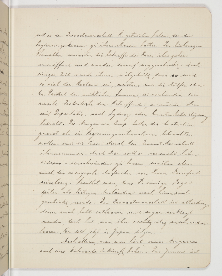 were those of Provost Marshal R., who was in charge of the government coffers. The previous administrators had to hand over the coffers unopened and were then sent away. After some time they were informed that the balance of each coffer was such and such, in most cases only half or a third of what it should have been. If anyone dared to protest, he was threatened with deportation to Sydney [or prosecution for] insulting a public official. At first, the Australians deemed The New Guinea Company to be a government enterprise and the Provost Marshal took charge of its coffer. Here too he is said to have tried to appropriate £30,000, but he was deterred by Mr Taeufert’s firm intervention. The upshot was that a few days later, T. was declared a troublesome foreigner and shipped off to Liverpool. The Provost Marshal, however, was dismissed soon after and even charged, but they let him decamp in time. He is said to be in Japan now.