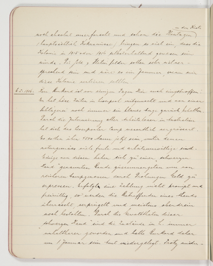 6.5.1916. A few days ago Mr Burkard arrived. He went through a hellish time in Liverpool and still has a black eye from a hiding. Because they are now interning all the unemployed in Australia as well, the Liverpool camp has grown substantially. More than