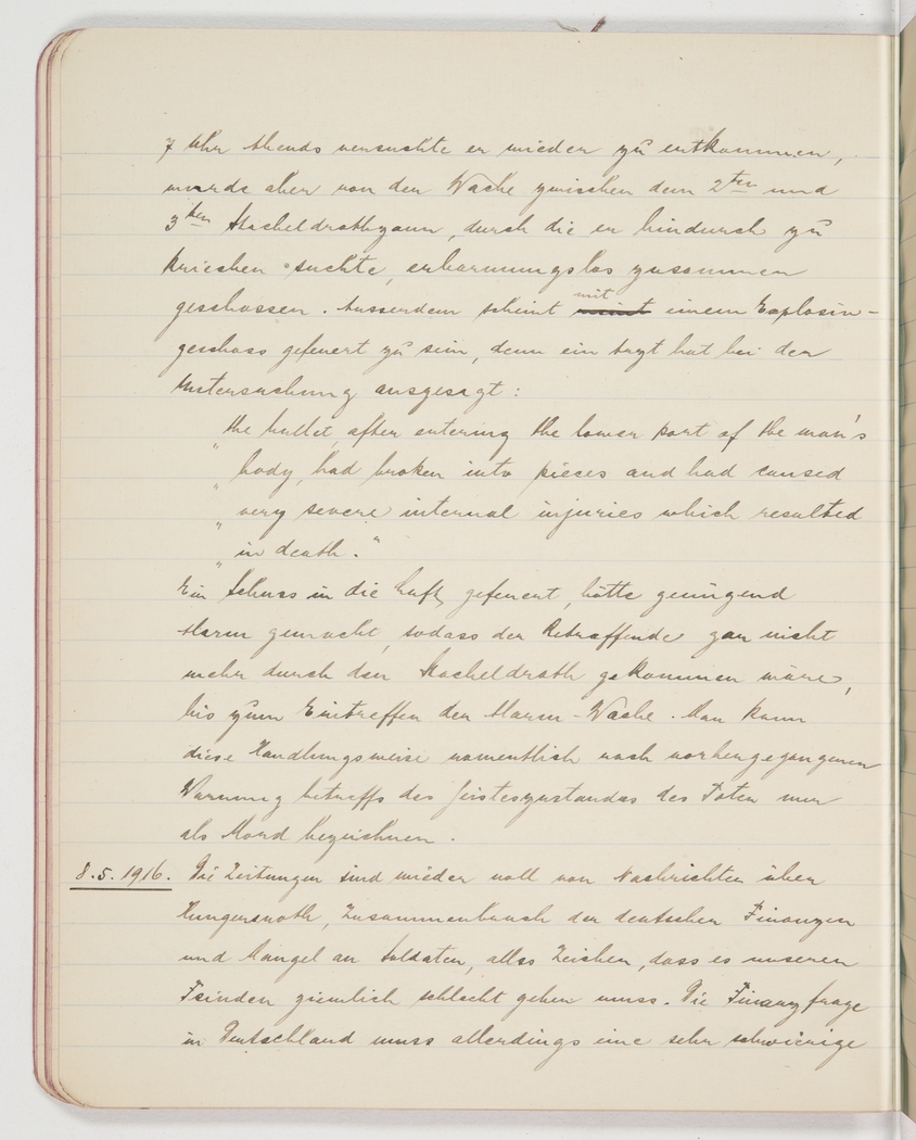8.5.1916. The newspapers are again full of reports about famine, collapse of the German finances and lack of soldiers, all signs that our enemies must be hurting. Germany’s financial affairs must indeed be difficult to judge.