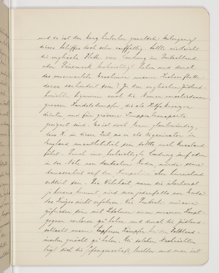 and the news of her sinking shortly thereafter is more than striking. Could the English fleet have planned to land in Germany or Denmark and was thwarted by the unexpected appearance of our deep-sea fleet? The English reports from Jutland mentioned that several of the big merchant ships served as auxiliary cruisers and they are ideal for major transports of troops. It’s not very plausible that K. should be travelling to Russia at a time when he, as the big organiser, would be indispensable in England. But his presence aboard the “Hampshire” would be amply explained in the case of an intended landing in or near Germany. We won’t know the truth before the end of the war, if indeed we will ever know it. We Germans have to be content with the loss, in Kitchener, of one of our main enemies and with having avenged, in the battle of Jutland, our courageous fighters at the Falkland Islands. Captivity is made easier by such news and one is