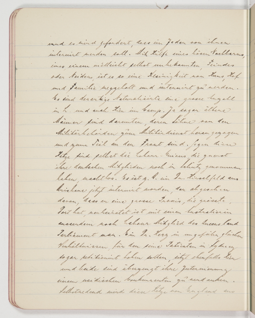 and even demand that all and sundry be interned. At the instigation of a spiteful neighbour, or even an unknown enemy or begrudger, one can easily be removed from hearth, farm and family and interned. There is a big number of naturalised settlers both in Liverpool and here. There are even elderly gentlemen among them whose sons were conscripted and are now serving at the front. Even the mighty trade unions that at first protected their German members are now powerless. For instance, they have interned a Dr Hirschfeld from Brisbane who, apart from having the largest surgery there, is also married to an Australian and was a Labor member of parliament. There is also a Dr Herz here, whose circumstances are similar and for whom his patients in Sydney even launched a petition. Both are convinced that they own their internment to an envious competitor. It goes without saying that this hate campaign is run from England,