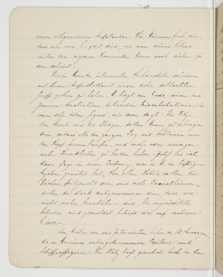 area, they say. Heat, dust and flies are barely bearable, and everybody is wearing veils all day long and suffers from one or the other disease. Now I’ve read in a newspaper that B. was devastated by a cyclone; apparently the roofs have flown off all the hotels and several private residences have been damaged so badly that they are no longer