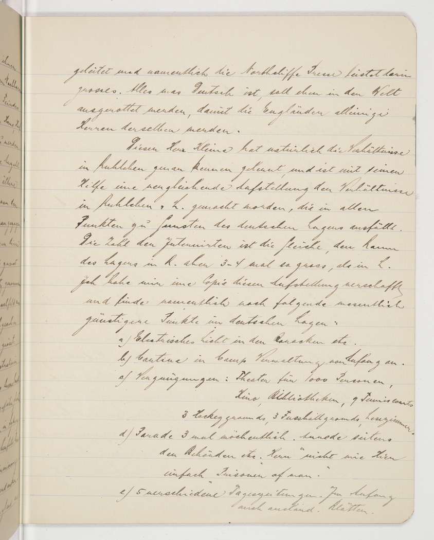 The afore-mentioned Mr Kleine, of course, got to know Ruhleben extremely well and with his help they have drawn up a comparison between the conditions in Ruhleben and L., which in every aspect favours the German camp. The number of internees is the same, but there is 3-4 times more space in R. than in L. I have managed to get a copy of that comparison and a few other points have struck me as particularly in favour of the German camp:
