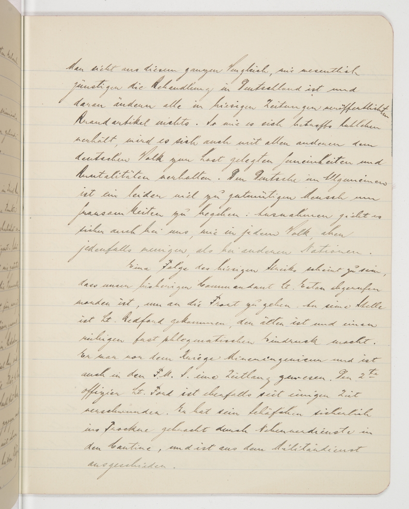 17/8/16. I was greatly surprised to hear, upon returning from the beach for lunch, that a cousin of mine had arrived. I was racking my brains as to who this cousin could be when Mr [Lenzstein?] from Borneo approached me. Although he is not a relative of mine, he is related to my wife and so I welcomed him warmly. He arrived in Australia in early June after having been interned since March of this year near Jesselton, as were all of Borneo’s Germans. They were very well treated there, as we were in Singapore, but had to make the voyage to Australia in the belly of a coal ship. But at least they had the good fortune of staying free that long. All up about 20 men came on the coal ship, some of them from Singapore and among those Mr Leo Stein from my company. Mr Stein pretended to be a Russian because his father was living in Germany as a non-naturalised Pole before the war. He himself was born in Germany. For a while they believed him,