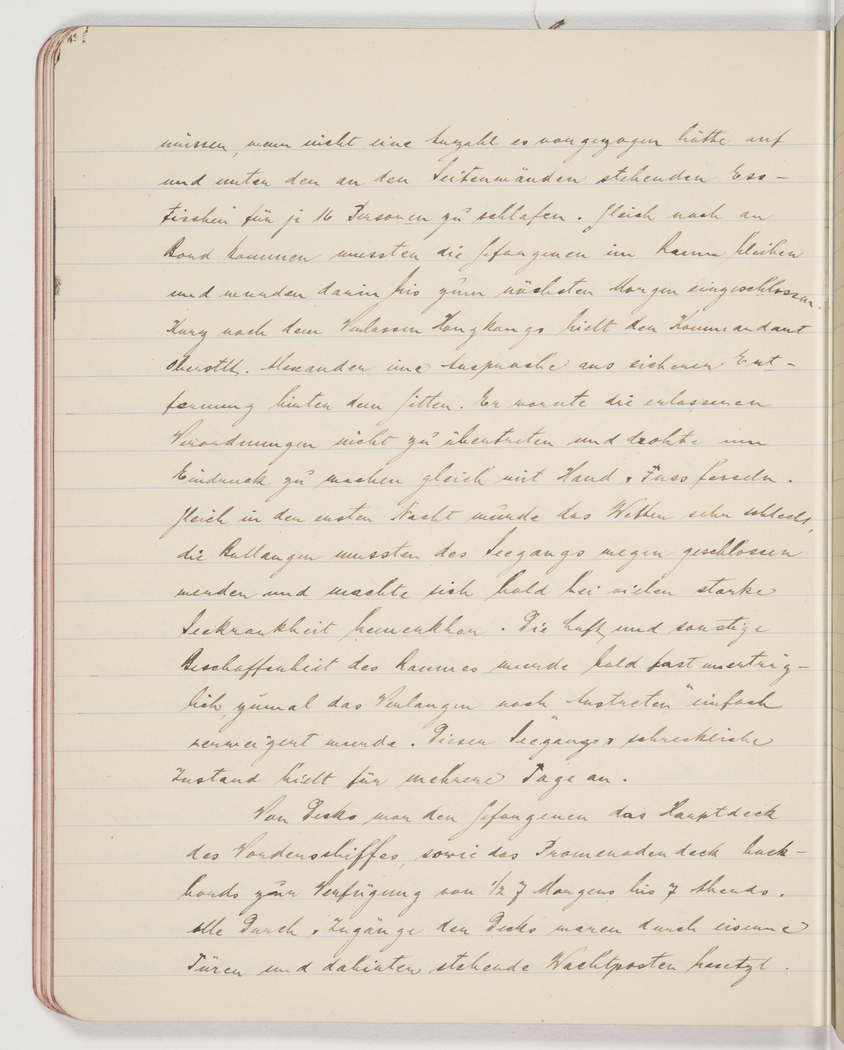 Needless to say, the space granted on deck for the 300 men was totally insufficient so that they had to sit or lie next to each other like sardines when they wanted fresh air; any physical activity was out of the question. My friend says, literally: “While the
