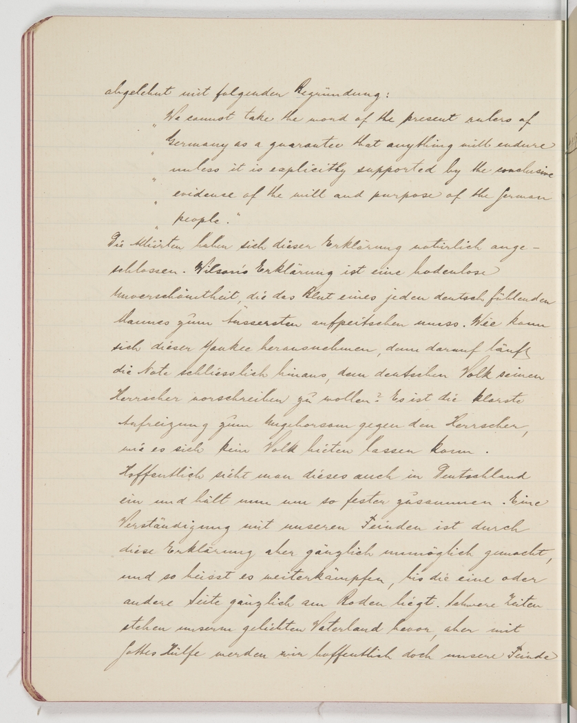 <p>[Page 101]</p><p>to participate on the following grounds: [begin English quote]</p><p>“We cannot take the word of the present rulers of Germany as a guarantee that anything will endure unless it is explicitly supported by the conclusive evidence of the will and purpose of the German people.” [end English quote]</p><p>The Allies, of course, have seconded this declaration. Wilson’s statement is a bottomless impertinence that has to get any German-thinking man’s blood boiling. How can this Yankee have the audacity to dictate to the German people – and that’s what this amounts to – which ruler they should have? It’s a most definite call for insubordination against a ruler and no nation should accept that. Hopefully, they’ve come to the same conclusion in Germany and will finally show some unity. But an understanding with our enemies has been rendered completely impossible by this declaration, which means we have to fight on until one or the other side is brought to its knees. Our beloved homeland faces tough times ahead, but let God help us overcome our</p>