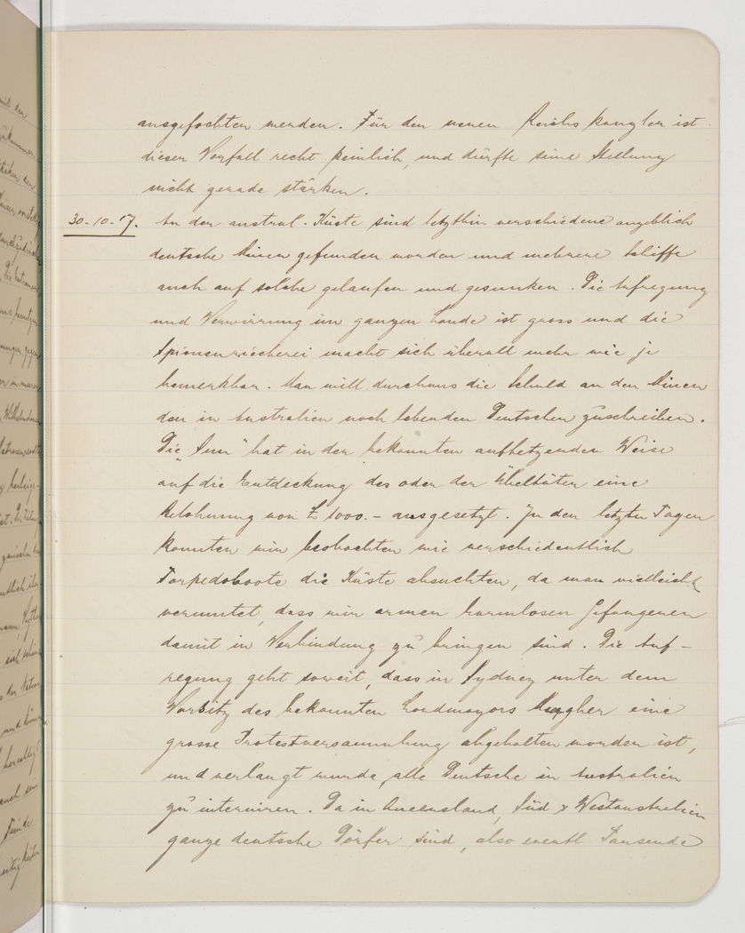 <p>[Page 108]</p><p>face the internal strife. The latest incident has to be an embarrassment to the new Reich Chancellor and will surely not help his position.</p><p>30/10/17.<br />Along the Australian coast they have recently detected several mines, reportedly German, and several ships have run into some and sunk. There is great uproar and confusion across the country, and the spy hunt is more virulent than ever. They squarely blame all Germans still residing in Australia for the mines. The “Sun”, in its usual incendiary style, has put up a reward of £1000 for the identification of the perpetrators. In the past few days we have spotted various torpedo boats searching the coastline, they probably think that we poor, innocuous prisoners have anything to do with it. The uproar is so big that they held a protest meeting in Sydney, chaired by the notorious Lord Mayor Meagher, which demanded that all Germans in Australia be interrogated. Since there are several German townships in Queensland, South and Western Australia, which means probably thousands</p>