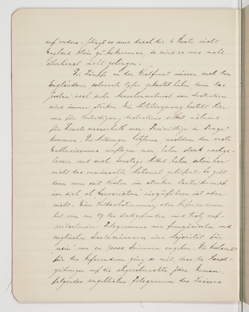 <p>[Page 13]</p><p>no matter what. If we can’t wear the English down with our U-boats, we probably can’t succeed at all.</p><p>The battles on the western front must have come at great cost to the English as well, because the clamour for more human material from Australia is growing louder by the day. There is no conscription here except for the defence of the country itself, and for battles elsewhere they have to rely on volunteers. But after the initial enthusiasm, volunteer numbers have dwindled considerably, and it seems other measures are not yielding the hoped-for material either. Thus, for weeks now, a political war has been raging over whether to introduce conscription. A referendum was held on the 27th, and despite inflammatory telegrams from French and English politicians, a majority of 9,000 voted against it. The campaign for the referendum went so far as to inspire the major newspapers to resort to the tasteless idea of publishing a telegram reputedly sent</p>