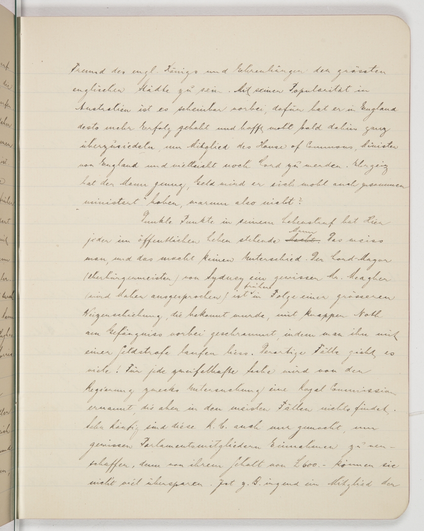 <p>[Page 20]</p><p>a friend of the English King and a honorary citizen of the major English cities. His popularity in Australia seems to be fading but he is all the more successful in England and will be hoping soon to return there for good, becoming a member of the House of Commons, a minister of England and maybe even a Lord. The man seems to have more than enough ambitions and financially he would have milked his office for all its worth, so why not?</p><p>Every might man in public office here has a few dark spots in his curriculum vitae. Everybody knows it and it makes no difference. The Lord Mayor of Sydney, a certain Mr Meagher (pronounced Maher), once narrowly escaped imprisonment over a major wheat scandal by getting off with a fine. There are many cases like this! In any dubious case the government appoints a Royal Commission to investigate which almost never finds anything. Very often these Royal Commissions are appointed solely to give certain parliamentarians an extra source of income, because their pay of £600 doesn’t leave much to save. If for example a Labor MP</p>