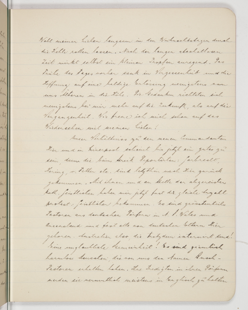 <p>[Page 24]</p><p>a toast to my beloved I have slowly let the wine roll down my throat during the holiday. After a prolonged abstinence even a small drop is stimulating. The previous day’s grief slowly sank into oblivion and the hope of an imminent release, at least of us elderly, began its rise. I at least was focusing more on the future than on the past. How I look forward to seeing my beloved family again!</p><p>Our relations with the new commanders here and in Liverpool seem to be good so far because those deported during the strike – Gerbrecht, Hering, von Fetten, etc – have recently returned. With them, and after the departure of some Catholic clergymen, we now have almost the same amount of Protestant priests. They are mostly pastors from German villages in NSW and Queensland, and almost all born here of German parents, Australians, in fact, and yet interned! An incredible nastiness! They are pretty harmless and we’ve dubbed them bush pastors. I assume they had to hold their sermons in those villages mostly in English,</p>
