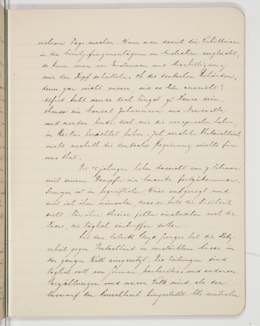 <p>[Page 34]</p><p>several days. When you compare this with the conditions in the Australian camps for civilians, you can only shake your head in astonishment and disapproval. Do the German authorities have no inkling of what it looks like here? By now, Alfred Suhl would have been home for some time, as would Consul Johannsen from Newcastle, and both would have reported to Berlin, as promised. I really do not understand why the German government is doing nothing for us.</p><p>The 45-year-olds have a good chance to get away on February 7, on a steamship via America. Franzen naturally is quite agitated and I wish for him that he will soon taste freedom. They are still awaiting their passports, which should get here any day now.</p><p>Since Lloyd George came to power, the smear campaigns against Germany have gathered momentum all over the world. Daily the newspapers are full of German barbarities and other tall tales, and our people are portrayed as the scum of the earth. All neutral</p>