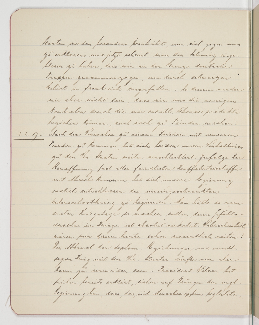 <p>[Page 35]</p><p>states are being worked on to side against us, and Switzerland even was told that German troops were gathering at its borders and would cross Swiss territory to invade France. But we are hardly as stupid as to turn the few remaining neutral countries against us, since they are the only ones that could still supply us with foreign goods.</p><p>2/2/17.<br />Regrettably, since our attempts to reach a peace agreement with our enemies, our relations with the United States have further deteriorated. Because almost all enemy merchant ships have been equipped with cannons, our government has finally decided to launch an all-out submarine war. They should have done so from day one, because sentimentalities have absolutely no place in war. Presumably we’d be much more advanced by now! It will be hard now to avoid suspension of diplomatic relations, and even war, with the United States. President Wilson has previously declared, probably prompted by the English government, that any sinking of an American ship that cost human lives</p>
