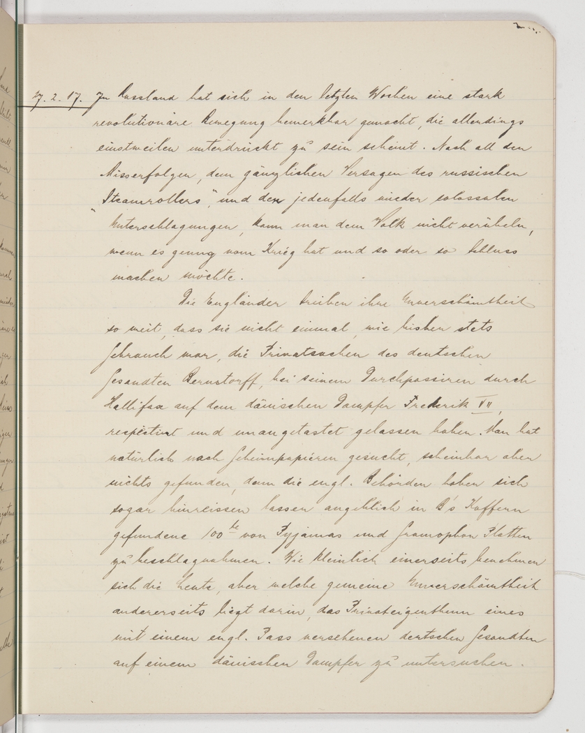 <p>[Page 38]</p><p>27/2/17.<br />In Russia in recent weeks, a strong revolutionary movement emerged which however seems to have been quashed for the time being. After all the mishaps and the downright failure of the Russian “steamroller”, not to mention the reoccurrence of colossal misappropriations [could also be ‘suppression’] it would be highly understandable if people had enough of the war and would just want it to end.</p><p>The English have now reached a new height of impertinence by no longer respecting the principle of diplomatic immunity when the German envoy Bernstorff transited Hallifax [Halifax] on the Danish steamship Frederik VII, and searching his private belongings. Naturally, they were looking for classified documents but don’t seem to have found any, because the English authorities were frustrated enough to allegedly confiscate hundreds of pyjamas and gramophone records found in B.’s luggage. How petty people can be, and what colossal outrage it is to search the private belongings of a German diplomat with an English passport on a Danish ship.</p>